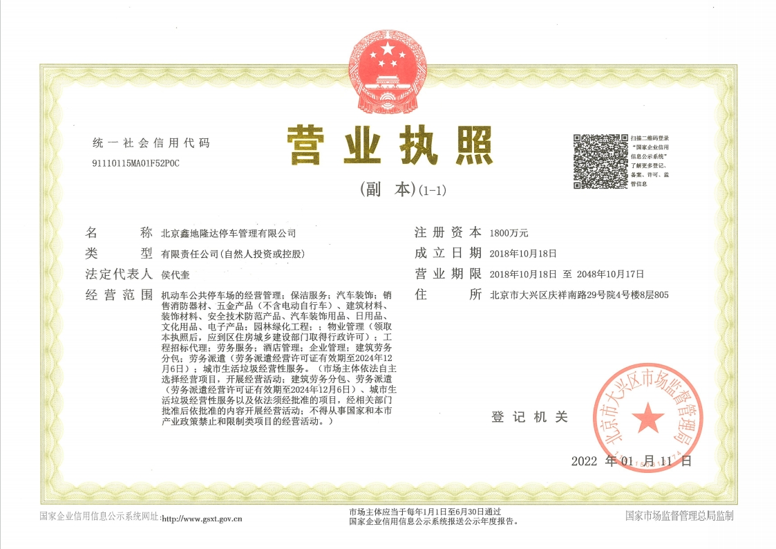 北京鑫地隆达停车管理有限公司是一家成立于2018年10月的专业提供停车管理与服务的综合性企业,注册资金人民币1800万元,公司本部位于大兴区,公司业务范围:劳务派遣、劳务服务、劳务分包。公共建筑、商业中心、市政机构、游乐场所、居民社区的停车场,为不同的客户量身提供停车场规划方案、设计咨询、工程施工、运营管理等全方位的专业化服务。